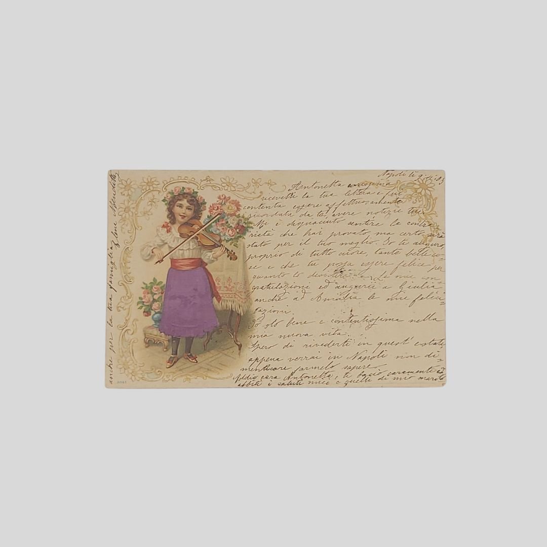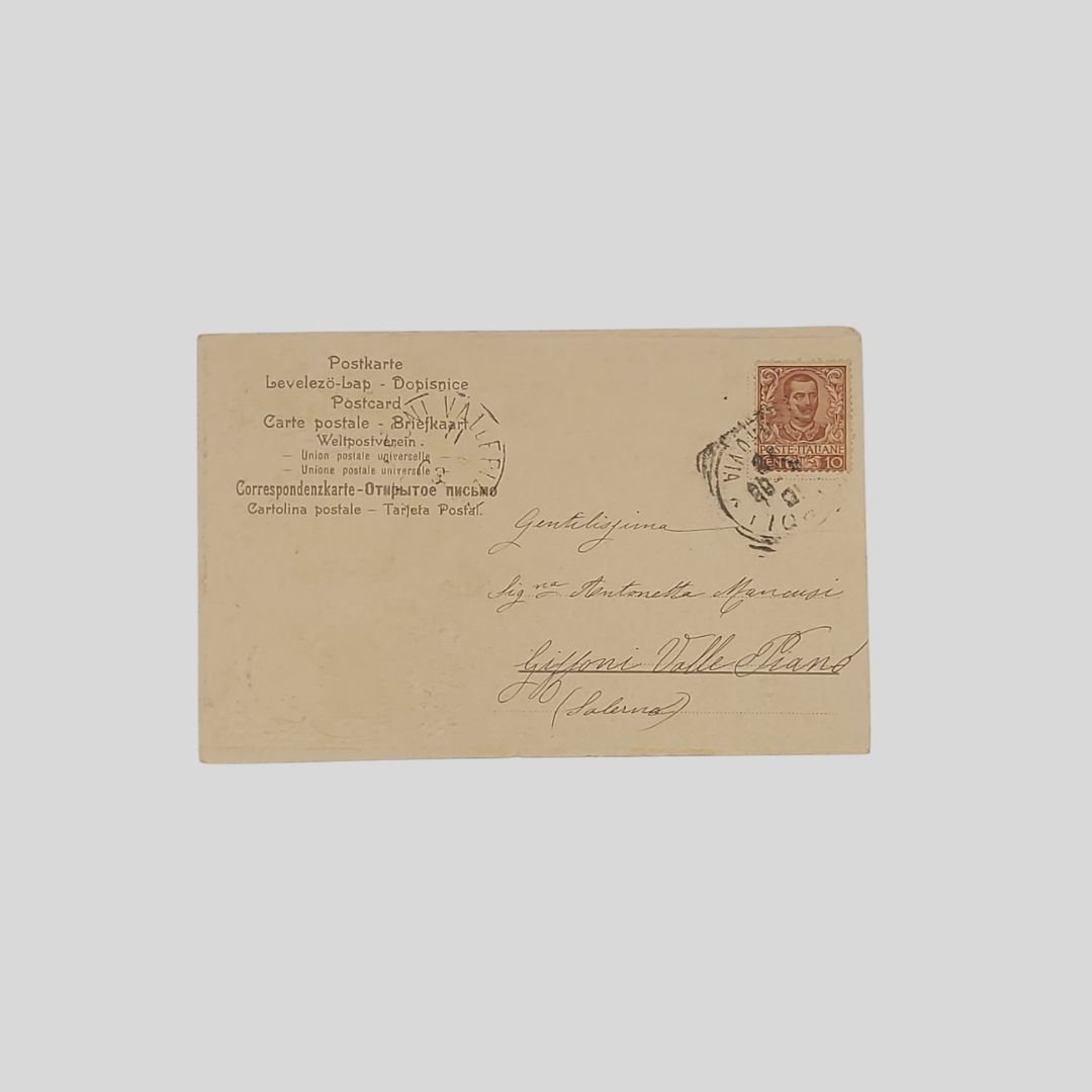 Cartolina goffrata d’epoca. Undivided back. Viaggiata, inviata il 9/05/1905, cm 14×9. Francobollo, timbri. In buone condizioni.