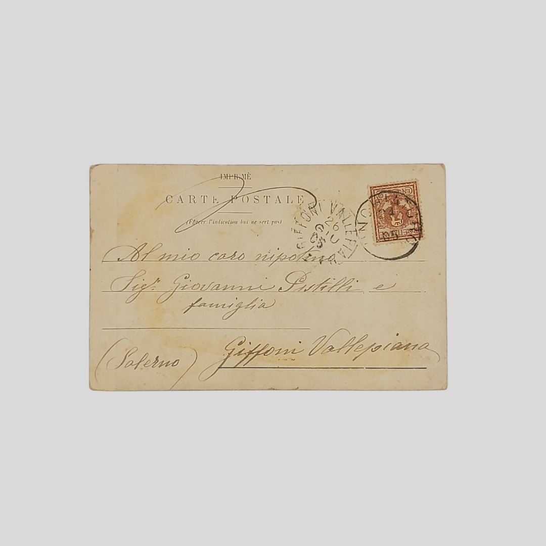 Cartolina d’epoca. Undivided back. Viaggiata, cm 9×14, s.d. (primi ‘900). Francobollo, timbri. Lievi tracce d’uso agli angoli.
