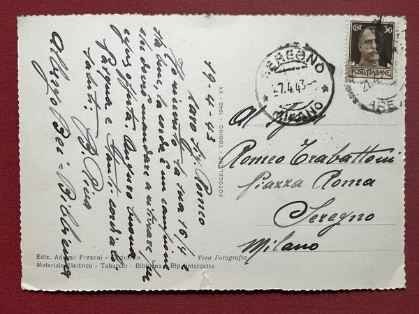 Cartolina - Bibbiena - Panorama e Stazione Ferroviaria viste dall'Arno - 1943