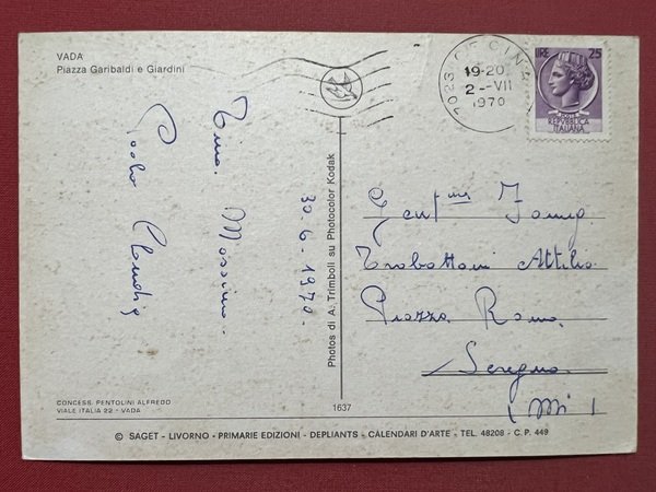 Cartolina - Vada ( Livorno ) - Piazza Garibaldi e Giardini - 1970