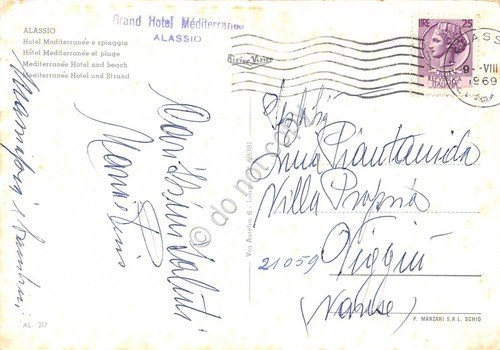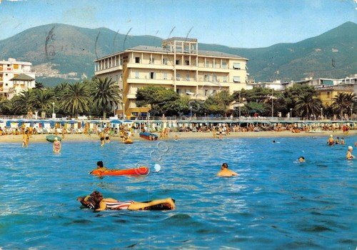 Cartolina Alassio Hotel Mediterranee spiaggia animata panorama dal mare 1969