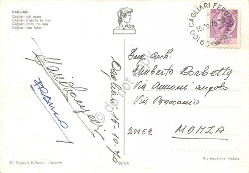 Cartolina Cagliari panorama dal mare barche a vela 1970 segnata
