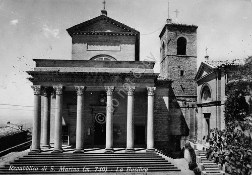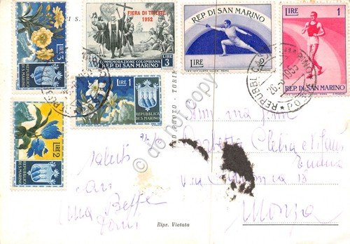 Cartolina Repubblica di San Marino Basilica 1955 francobolli al retro