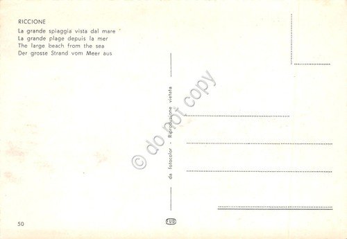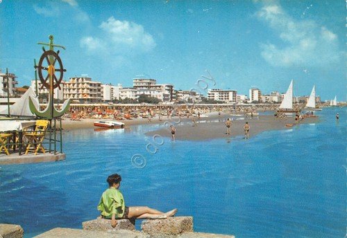 Cartolina Riccione la grande spiaggia vista dal mare hotel animata vela