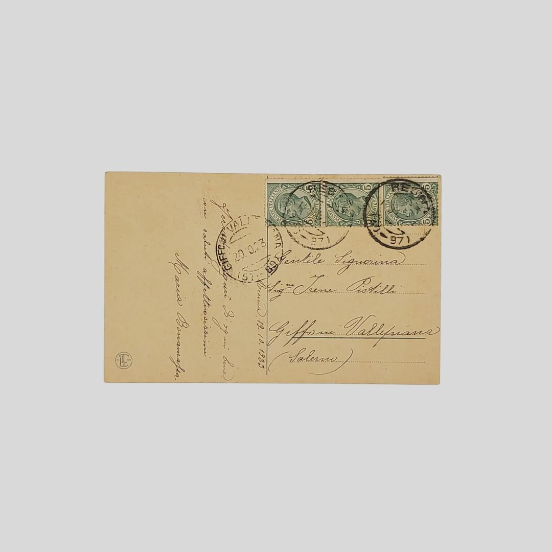 Cartolina pittorica d’epoca. Viaggiata, invio del 19/10/1923, cm 13,8×8,7. Francobolli, timbri. In buone condizioni.
