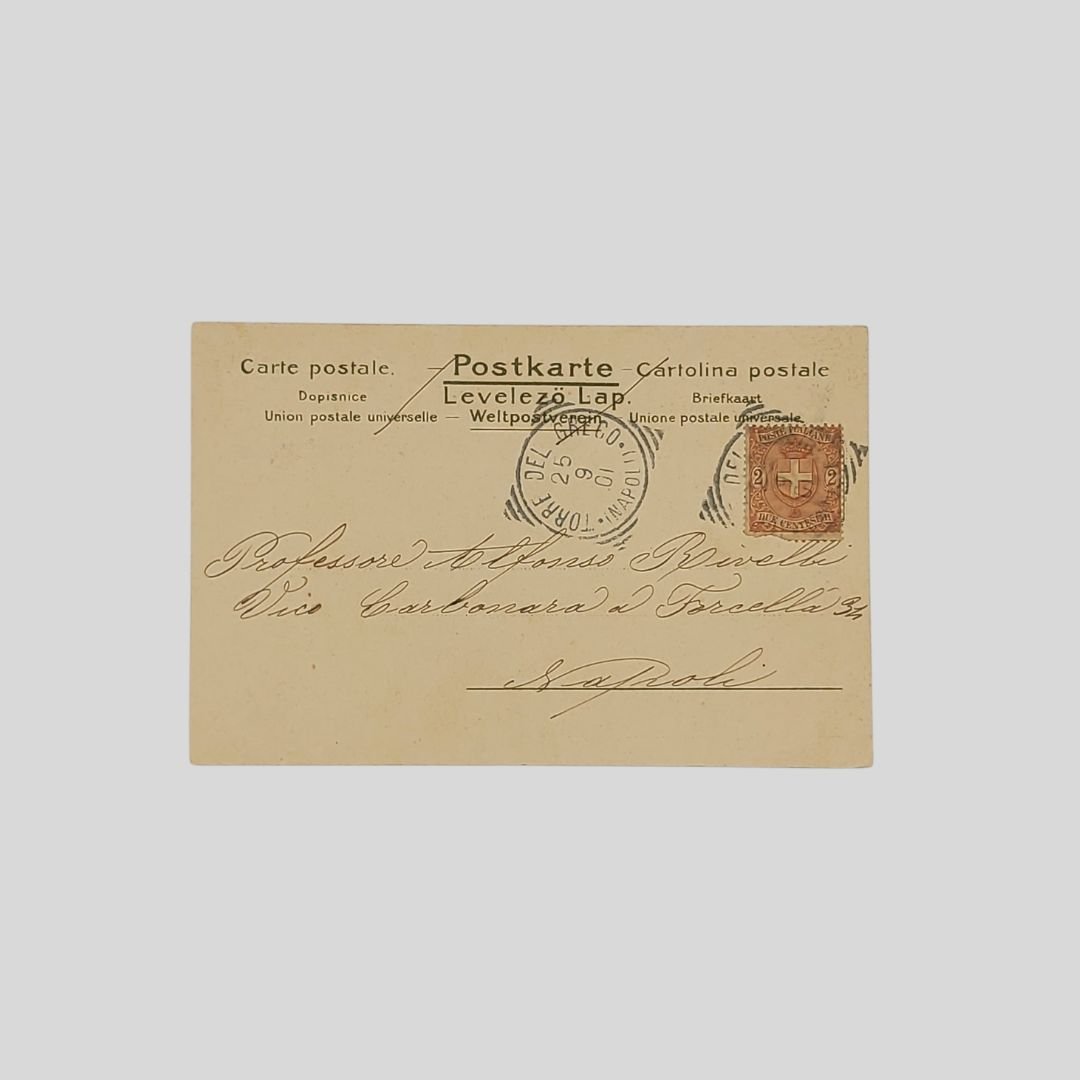 Cartolina d’epoca. Undivided back. Viaggiata, s.d. (fine’800), cm 9×14. Francobollo, timbri (25/9/1901). In buone condizioni.
