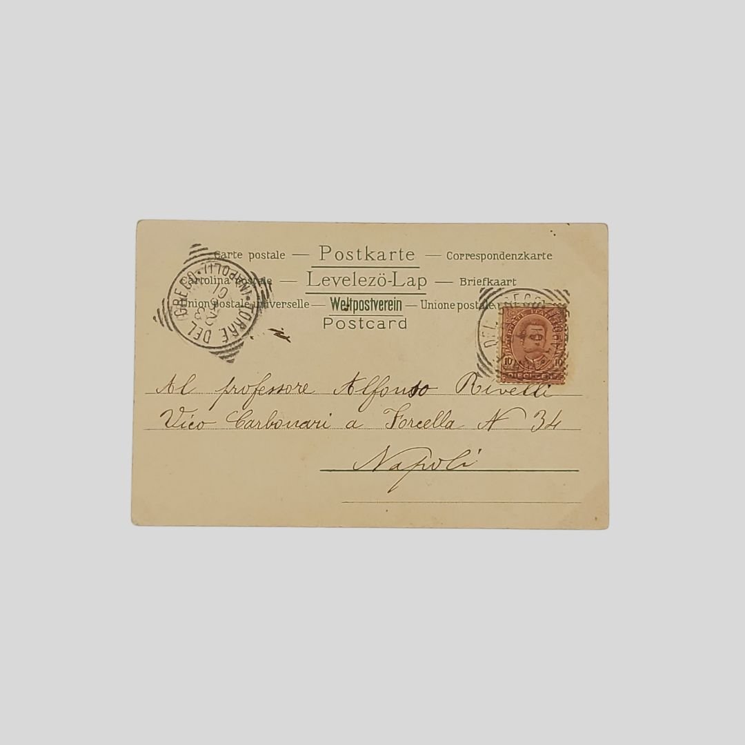 Cartolina d’epoca. Undivided back. Viaggiata, s.d. (fine ‘800), cm 9×14. Francobollo, timbri (23/6/1901). Lievi tracce d’uso.