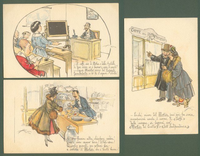 MAZZA ALDO. MOKAR caff¨ coloniale. Tre cartoline pubblicitarie disegnate a colori. Non viaggiate, circa 1925. Ottima conservazione eccetto minimi punti di ingiallimento a retro. (Rif.C2700)