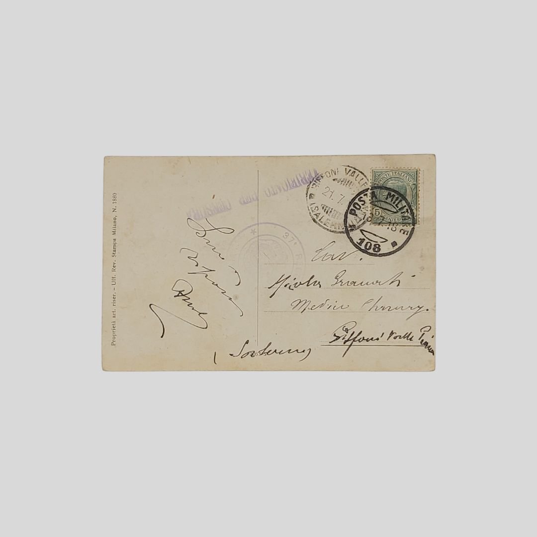 Cartolina pittorica d’epoca. Viaggiata, cm 13,5×8,8. Francobollo, timbri (18/7/1918). Tracce d’uso.