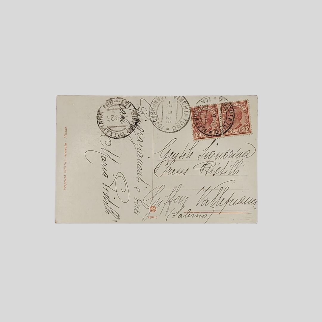 Cartolina pittorica d’epoca. Viaggiata, cm 13,7×8,7. Francobolli, timbri (3/9/1925). Lievi tracce d’uso agli angoli.