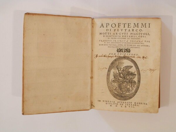 Apoftemmi di Plutarco, motti arguti piaceuoli, e sentenze notabili, cosi di principi come di filosofi. Tradotti in lingua toscana per M. Gio. Bernardo Gualandi . con due tauole, l'vna de' nomi de gli autori, l'altra delle cose più notabili