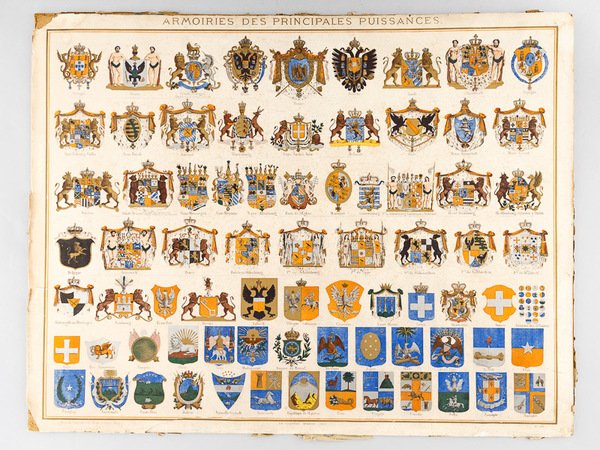 Un tableau en couleurs format 68 x 53.5 cm contrecollé sur support cartonné rigide, Encyclopédie Bouasse-Lebel, n° 94, s.d. [ circa 1860 ? ] Intéressant tableau héraldique en chromolithographie, en état modeste (déchirure et petits accrocs dont un petit manque angulaire n'affectant pas l'impression) méritant restauration.