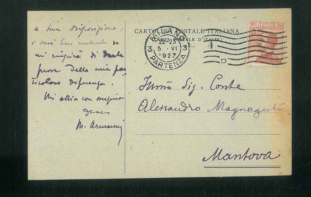 Cartolina con logo Ulrico Hoepli datata 5. vi. 1923 manoscritta ai due lati e firma autografa