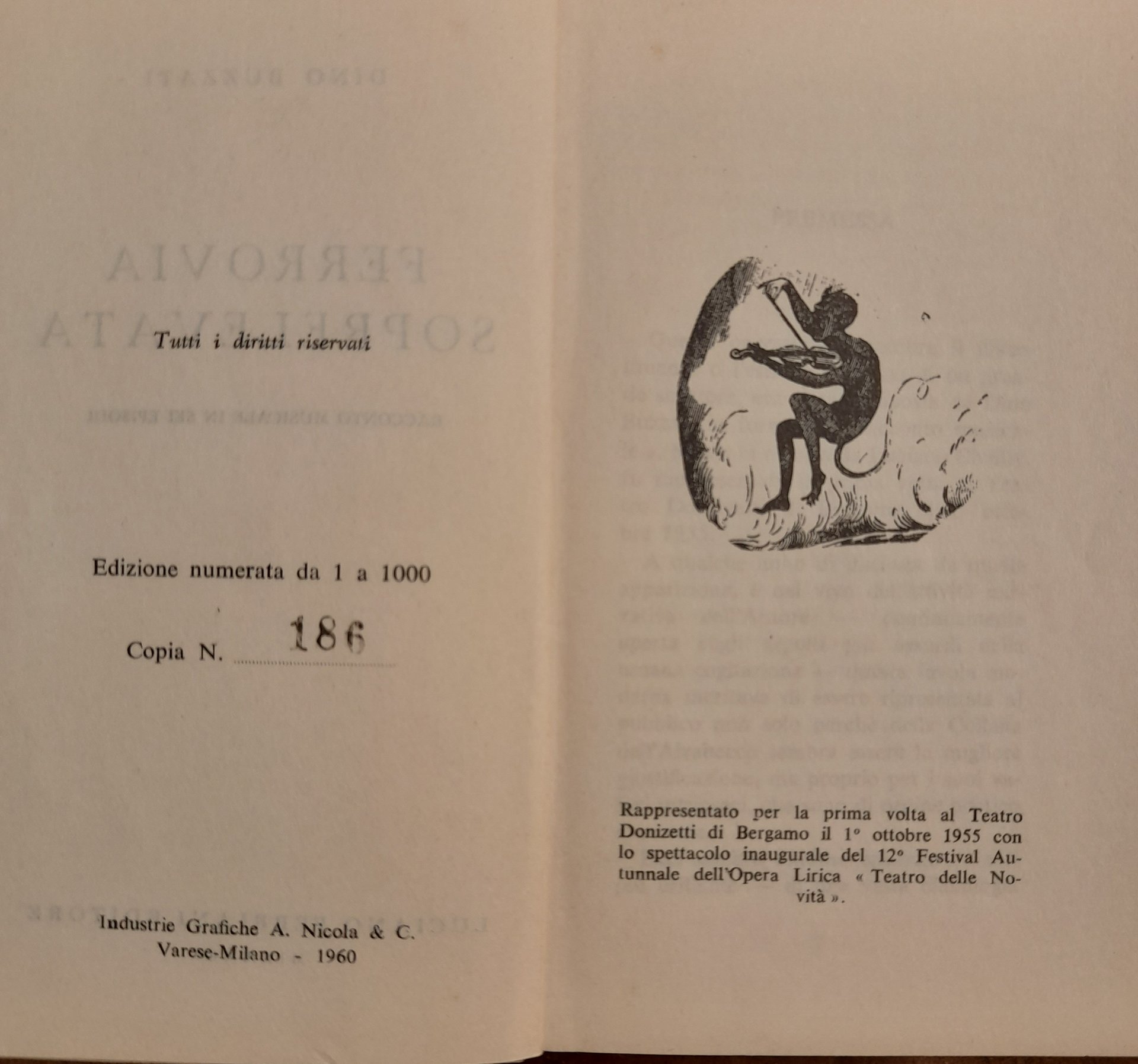 Racconto musicale in sei episodi. In 24mo, pag. 63 (1), con 2 disegni in b/n nel testo. Bossura editoriale con alette e illustrazione sul piatto, esemplare numero 186 dei 1000 impressi. Perfetta conservazione. Codice inv.1031067