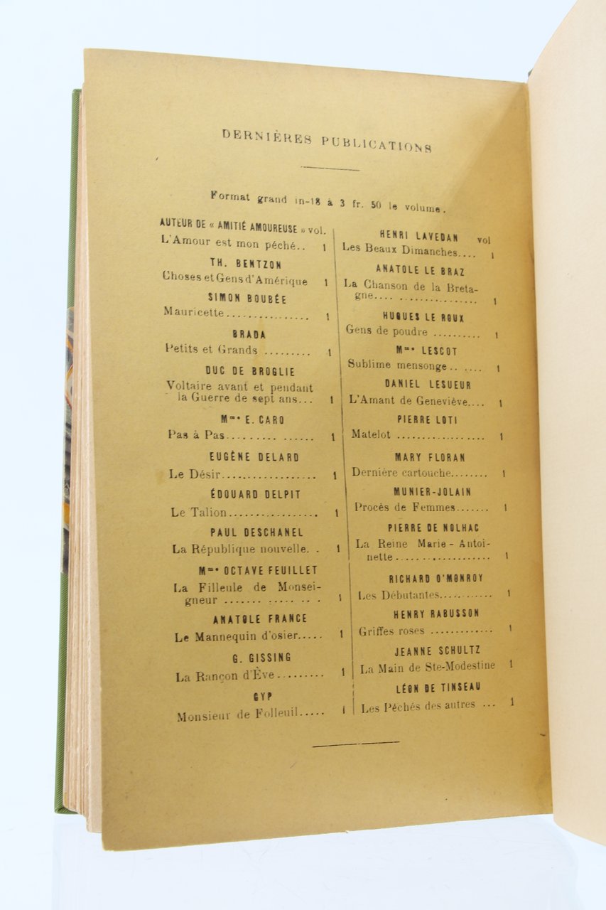 Calmann Lévy | Paris 1899 | 11.50 x 18.50 cm | relié | [ENGLISH DESCRIPTION ON DEMAND] | Edition originale sur papier courant. Reliure à la bradel en demi percaline vert amande, dos lisse orné d'un fleuron doré, date et double filet dorés en queue, pièce de titre de chagrin marron, plats de papier marbré, couvertures conservées, reliure de l'époque signée à froid Carayon. Gardes partiellement ombrées. Bel exemplaire joliment établi.