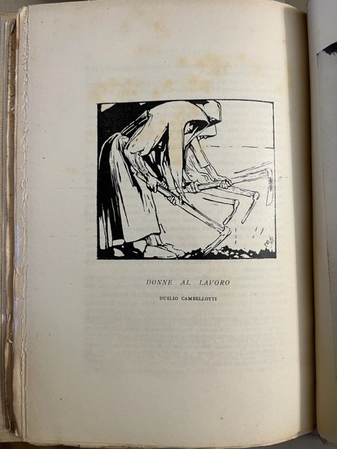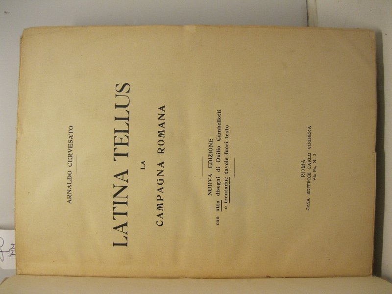 In 8, pp. XVI + 238 + (2) con 32 tavv. f.t. con foto in b/n. e 8 ill. n.t. di Duilio Cambellotti. Lievi taglietti al marg. sup. della 2o c. Legatura in p. tl. coeva con tit. oro entro tassello al d. Seconda edizione di ques'opera sulla campagna romana con notizie storiche sulle vie consolari e il 'Latium vestus' e descrizione dei villaggi e delle capanne, delle ville, del Tevere e della sua foce, del litorale, delle paludi pontine, delle chiese e cimiteri, etc.