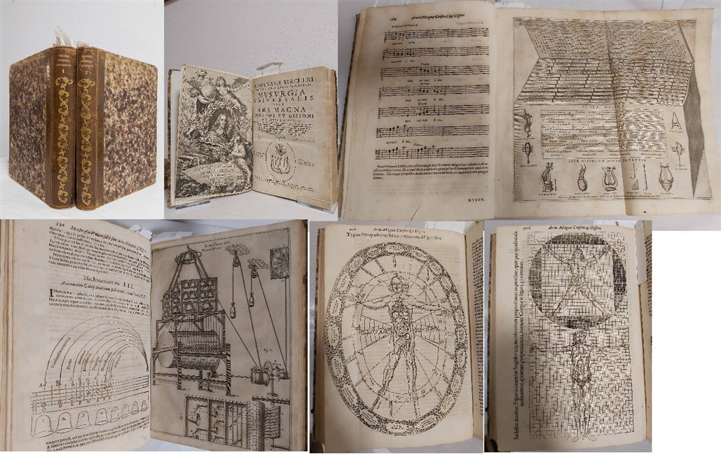 2 voll. in folio, pp. (20), 690; (2), 462, (38), bella leg. m. pelle ottocentesca con fregi ai d., piatti in carta dec. Antip. al primo vol. inc. in rame raff. il ritr. dell’Arciduca Leopoldo d’Austria. Con molte incis. in legno n.t. e 3 pagine interamente inc. in legno a p. pag. Con 19 (su 21) tavv. inc. in rame, anche ripp. Manca una tav. che doveva essere in antip. al II vol. e manca antip. al I vol. Prima ediz. La più rara e importante opera del K. (1602-1680), quasi una sorta di enciclopedia delle nozioni musicali del tempo, compilata in pieno periodo barocco. Contiene anche pagine di musica annotata di diversi brani musicali del XVI e XVII sec. Interess. anche per la parte che concerne la costruzione degli strumenti musicali, sia antichi che contemporanei, dove l’A. include anche la spiegazione di alcuni strumenti di sua invenzione. Caillet 5785. Brunet II, 668. Graesse IV, 21. Honeyman Collection 1816. Legg. alone sulle prime 25 cc, per il resto ottimo esempl. a larghi margini. [388]