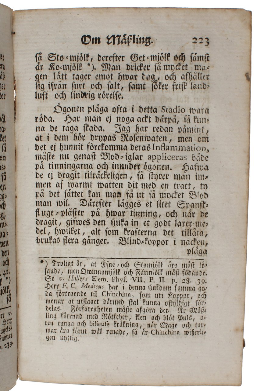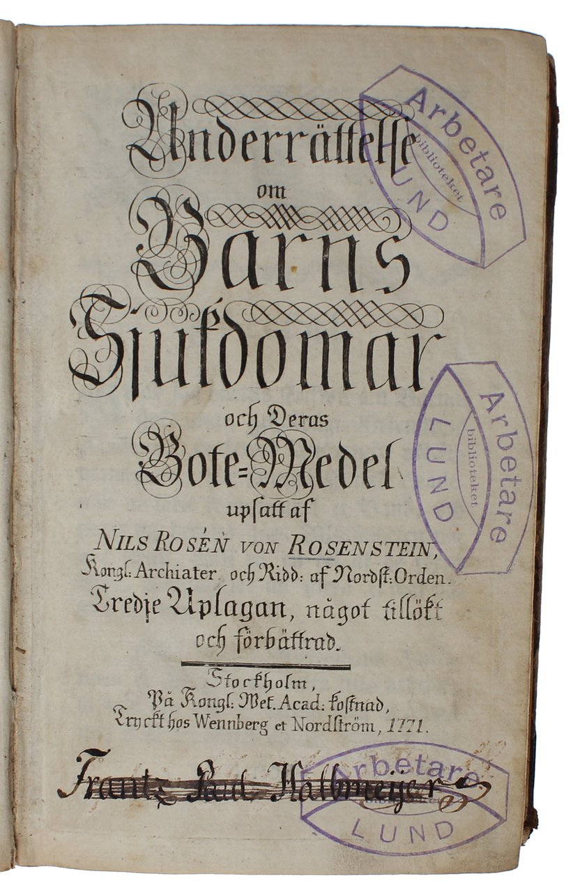 Stockholm, Wennberg et Nordström, 1771. 8vo. In contemporary haf calf. Wear to extremities, hindges and head and foot of spine missing some of the leather. Corners bumped and boards missing parts of the marbled paper. Two stamps to pasted down front and back end-paper and three stamps to title-page and previous owner's name crossed out, otherwise internally fine. (4), 340, (34) pp. Third edition of Rosenstein's seminal work on pediatrics. "Sir Frederic Still considered this work “the most progressive which had yet been written”; it gave an impetus to research which influenced the future course of pediatrics. Rosén was particularly interested in infant feeding. The Underrättelser were originally published in the calenders of the Academy and were later collected and issued in book form in 1764. English and German translations were published in 1776." (Garrison & Morton 6323). (Garrison & Morton 6323 - the first edition).