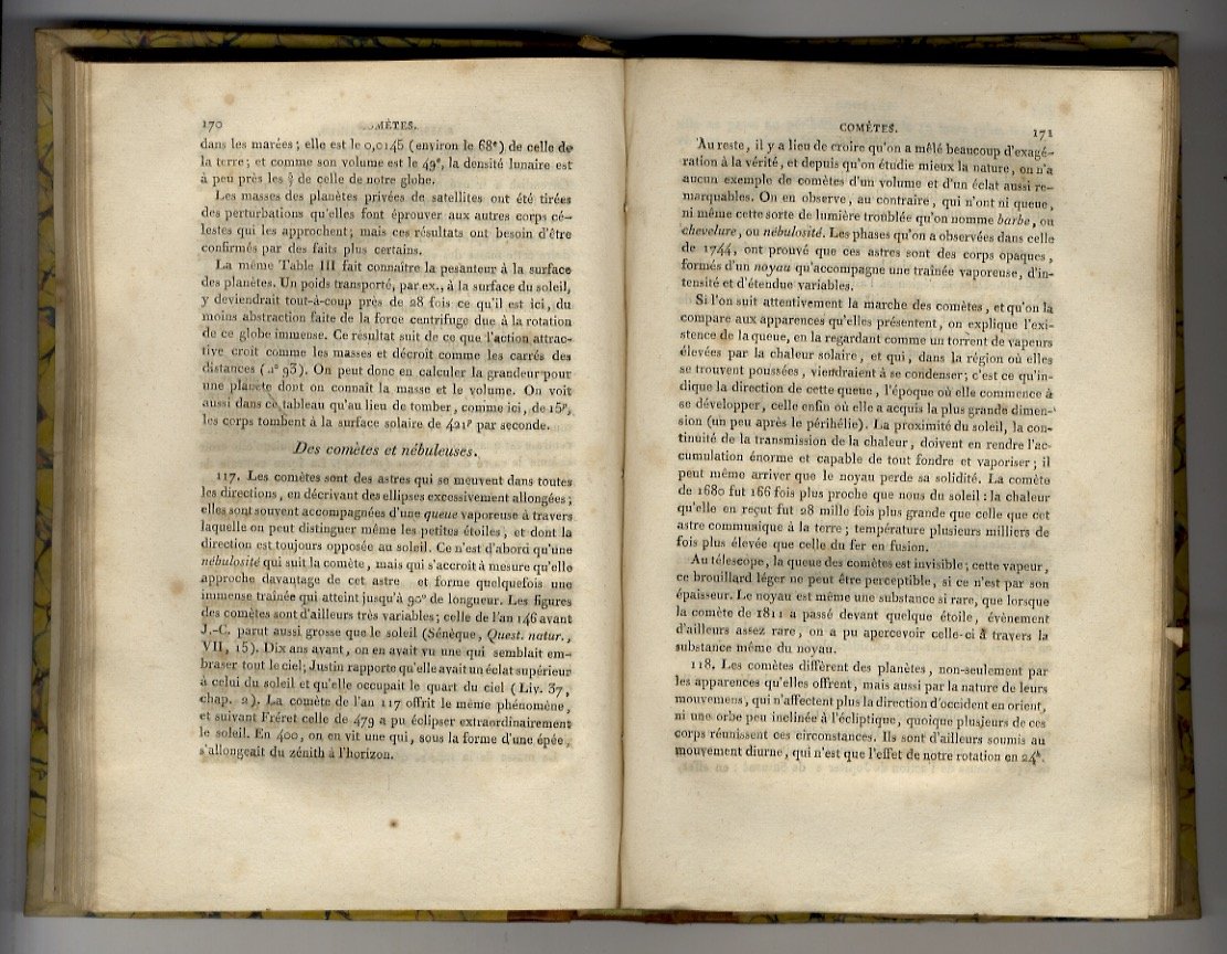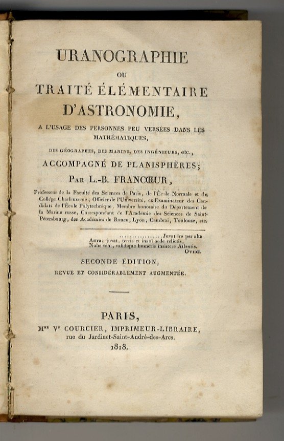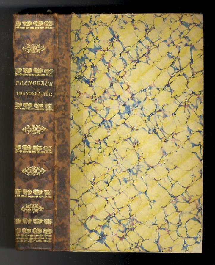 Paris, M.me V.e Courcier, 1818, in-8, ottima legatura coeva in mezza pelle marmorizzata, dorso con titolo e ricchi fregi impressi in oro, piatti in carta marmorizzata, pp. XV, [1], 528, + 11 tavole incise ripiegate in fine (fra le quali diverse carte del cielo). Bell'esemplare.