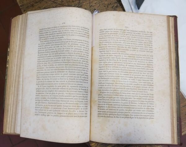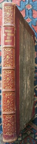 Challamel Editeur, Paris, s. d. (ma 1850 circa). In 4to piccolo, pp. 228, con tre tavole f. t. litografate e in coeva coloritura a mano (su sedici che avrebbero dovuto essere), elegante leg. con piatti in cartonato e dorso in pelle rossa con titoli e decori in oro, punte in rosso. Frederic Goupil Fesquet (1817 - 1878), an artist who travelled with the company of another painter Horace Vernet to Egypt and Syria taking the first dagerreotypes in the area. Only two months after the announcement in Paris 19 August 1839 about the discovery of photography, the first photographs in Egypt and Syria were taken by Frederic Goupil Fesquet. This work is an account of that famous journey which became a landmark in the history of photography in Egypt and Syria. Un ritaglio della carta al margine superiore dell’occhietto, mancano tredici tavole su sedici, piccole fioriture dovute al tipo di carta. Resta comunque interessante il volume per tutta la parte testuale.