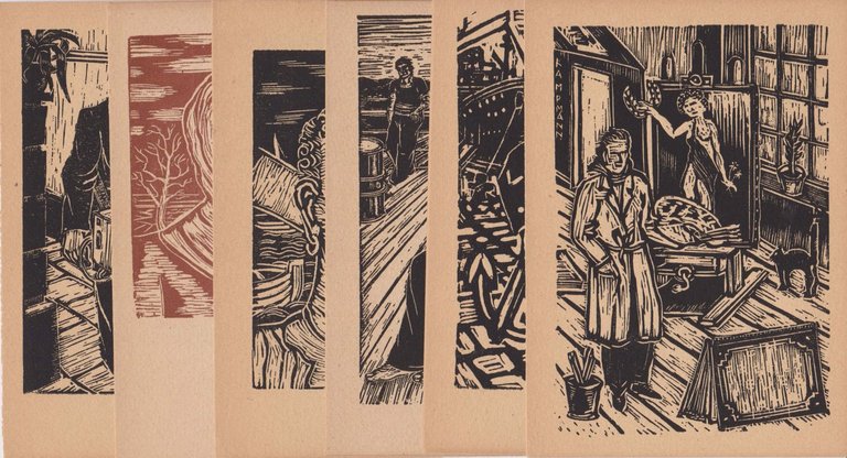 10 Postkarten mit Holzschnitten von Alexander Kampmann.