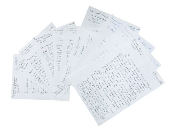 Various formats. Altogether 14 pp. on 11 ff. With 10 autogr. envelopes. 6 letters written in German, 5 in French. To German philosopher Christoph von Wolzogen. - An interesting correspondence on an interview with himself held and written down by Wolzogen, a study on Heidegger by Wilfried Franzen ("Diese Sehnsucht Heideggers nach Härte und Schwere habe ich immer selbst eingesehen: das Menschliche auf das Männliche, das Echte auf das Eigentliche - oder Eigene - reduziert - l'homme comme virilité un peu impitoyable [.]", 29. I. 1988), on appointments for further interviews, etc. "Je viens de recevoir le traduction en allemand de mon 'Humanism de l'autre jomme'. Je vœu remercie d'avoir consenti à la publication en annexe de ce livre des texte de notre entretien de 1985. Il a conserve sa forme vivante et je crois y traiter certain elements qui auraient manque dans sa publication originelle [.]" (24. VII. 1929).