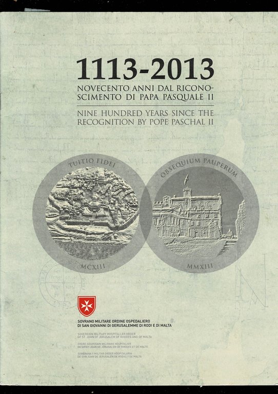 1113-2013 Novecento anni dal riconoscimento di Papa Pasquale II. Messaggio del Gran Maestro Fra' Matthew Festing e lettera "Pie postulatio voluntatis" di Papa Pasquale II al suo venerabile figlio Gerardo. Testi in inglese,italiano,francese,spagnolo,tedesco,latino. Allegata riproduzione dell'originale della lettera.