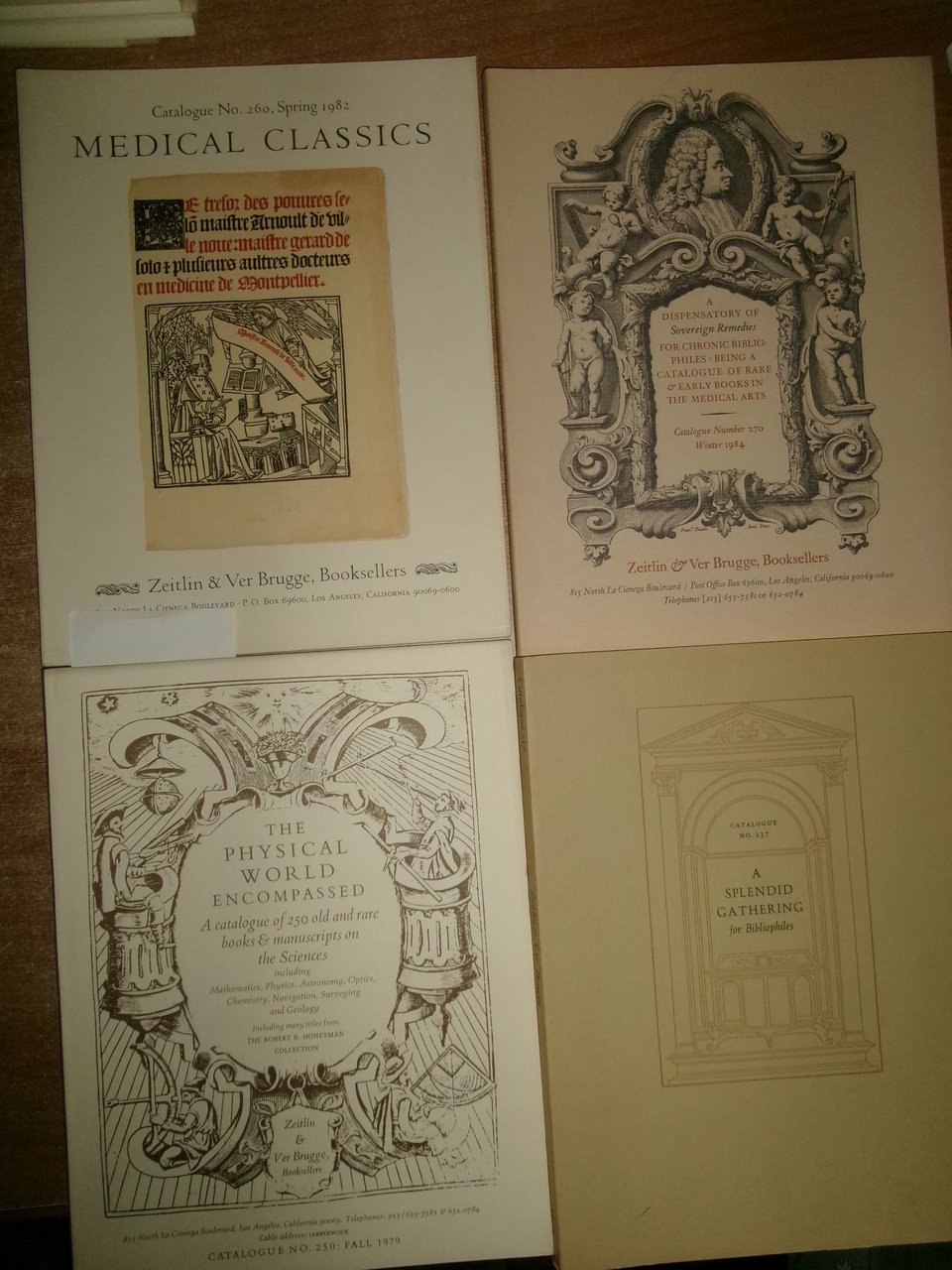 Zeitlin & Ver Brugge Booksellers. Los Angeles, California, 1966/1977. Catalogue no. 218/216/221/211/252/270/260/250/237/253/241/276. 12 cataloghi in-8° e in-4°, br. Accurate descrizioni in lingua inglese di numerosi e rari libri antichi di una delle più famose librerie antiquarie mondiali. Sono presenti molte illustrazioni/riproduzioni n.t. con prezzi in dollari. Ottimo stato. Neg. magazz. entro busta rossa.