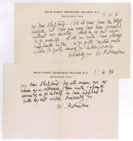 Obong 8vo. Altogether (½+1 =) 1½ pp. on 2 ff. On headed paper. To a Mr. Shepherd: "By all means use my name as a reference. I can write & speak warmly on your behalf if I am applied to [.]" (April 4). - "I didn't hear from the Polyt. people, but I hope you may have been successful without any backing. I send you my best wishes for your marriage, of which you write. I have always had faith in you & in your gifts. You should make a place for yourself among your contemporaries [.]" (April 11).
