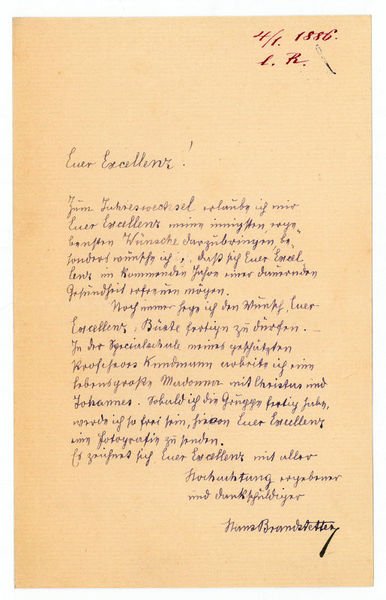 Zusammen (1+2 =) 3 SS. auf Doppelbll. 8vo. An den namentlich nicht genannten Staatsmann und Historiker Joseph Alexander Frh. von Helfert (1820-1910) mit Wünschen zum Jahreswechsel - "noch immer hege ich den Wunsch, Euer Excellenz Büste fertigen zu dürfen" (Br. v. 4. I. 1886) - und am Jahresende wiederholten Wünschen: "[.] Beigegebene Fotografie von meiner diesjährigen Studienarbeit 'Madonna mit Christus u. Johannes' bitte ich als Zeichen des Dankes annehmen und behalten zu wollen. Es soll ein kleiner Beweis sein, daß Euer Exzellenz nicht einem Unwürdigen die langjährige Unterstützung zu Theil werden ließen. Ich habe mich bei dieser lebensgroßen Gruppe geplagt und bemüht aber den Rompreis um den ich concurrirte gab man mir nicht. Es erhielt ihn ein Neffe des Professors Eisenmenger. Wie gerne ginge ich nach Rom um dort meinem Können die noch nöthige Weihe zu geben aber leider es fehlen die Mittel. Es wurden schon manche nach Rom geschickt, die jetzt nicht viel leisten, so daß ich mir oft denke, ohne eingebildet zu sein, daß ich es auch verdienen würde aber nicht jeder hat gerade das Glück [.]" (Br. v. 31. XII. 1886; ohne die erwähnte Photographie). - Brandstetter studierte an der Wiener Kunstakademie als Schüler von Edmund von Hellmer und Karl Kundemann. Nach einem Studienaufenthalt in Rom und Reisen nach Paris erfolgte 1891 seine Ernennung zum Professor für Modellieren an der Kunstgewerbeschule in Graz. Er schuf mehrere Denkmäler (darunter das Hebenstreit-Denkmal in Graz), Statuen, Portraitbüsten und Epitaphe. - J. A. Frh. v. Helfert war seit 1848 im Wiener Unterrichtsministerium tätig, gründete das Institut für Österreichische Geschichtsforschung an der Universität Wien, war Präsident der Zentralkommission zur Erforschung und Erhaltung der Kunst- und historischen Denkmäler und vertrat seit seiner Aufnahme ins Herrenhaus 1881 eine konservativ-patriotische Linie. Daneben war der Jurist und Historiker Präsident der Leo-Gesellschaft, Schwester der deutschen Görres-Gesellschaft, und Verfasser zahlreicher historischer Arbeiten.