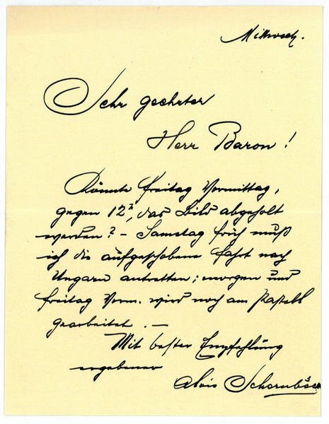 Zusammen 3 SS. auf Doppelblättern. 8vo. An einen namentlich nicht genannten Baron: “Heute kann ich [.] meine Pläne übersehen und muß mit Bedauern constatiren, daß vor März mit dem Portrait nicht angefangen werden könnte, weil zwei Besuche, Ungarn und Oberösterreich, zu erledigen sind im Februar [.]”. - Nach Studien bei Christian Griepenkerl an der Akademie der bildenden Künste in Wien und bei Ludwig von Löfftz an der Münchner Akademie ließ sich Schornböck 1892 als Portraitmaler in Wien nieder; 1917 wurde er Titularprofessor. Zu seinen Auftraggebern zählten insbesondere Mitglieder des Kaiserhauses und adlige Familien.