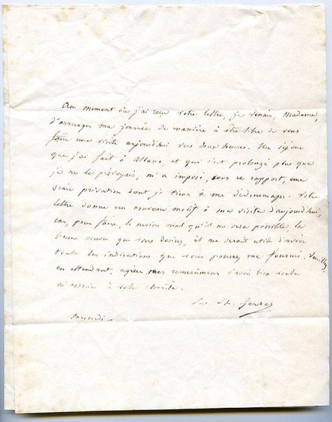 Zusammen (1+2¾ =) 3¾ SS. auf 4 (= 2 Doppel-)Blatt. 4to. Jeweils mit eh. Adresse (Faltbriefe). An die Marquise de Rende in Rom mit der Bitte, einer unglücklichen Frau zu helfen, die sich im Tiber ertränken wollte: "[.] Je crois que ce billet de charité que je vous demande pour une malheureuse qui avait eu la tentation de se noyer, ne sera pas inutile [.]" (Br. v. "vendredi 23 juin"). - Im zweiten Brief kündigt er seinen Besuch an, da er sich über "la bonne oeuvre que vous desirez" informieren müsse (Br. v. "Mercredi"). - Beide Briefe minimal fleckig, die Adreßblätter jeweils mit Siegelresten.