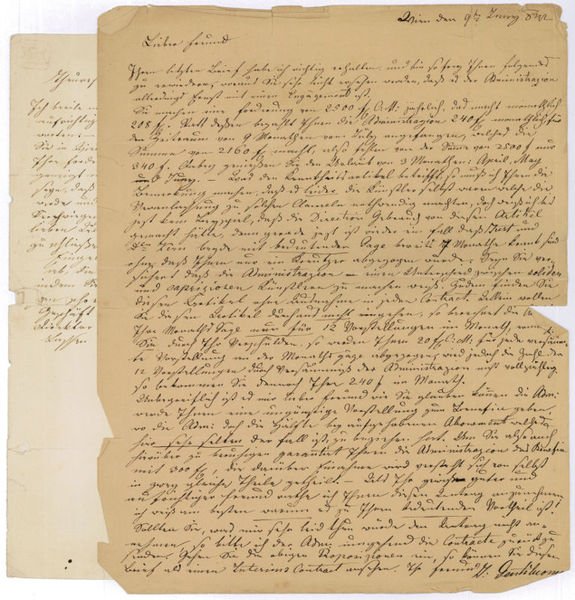 Zusammen (1+1=) 2 SS. auf 4 (= 2 Doppel-)Bll. Gr.-4to. Jeweils mit eh. Adresse (Faltbriefe). An den Sänger Ludwig Cramolini (1804-1884) in Darmstadt. - I. "[.] Sind Sie geneigt sich für das Fach eines Spieltenors in welchem Sie in Wien in herrlichen Andenken stehen, engagieren zu lassen, und sind Ihre Forderungen nicht zu überspannt, so ist die Administration allerdings geneigt mit Ihnen einen Contract abzuschließen. Sie dürfen versichert seyn, daß ich von Ihrem Vertrauen gewiß keinen Mißbrauch machen werden und daß die Unterhandlung unter dem strengsten Siegel der Verschwiegenheit geschieht [.] Eingeleitet habe ich die Sache, und nun hängt es nur von Ihnen ab, die Sache zu einen schnellen und guten Ende zu führen [.] Glauben Sie gewiß daß es mir ein heiliges Geschäft ist, Ihnen so wie de, mir sehr achtungswerthen Herrn Direktor Balochino dienlich zu seyn [.]" (3. V.). - II. "[.] Sie nehmen eine Forderung von 2500 fl. C.M. jährlich, das macht monatlich 208 fl. Statt dessen zahlt Ihnen die Administration 240 fl. monatlich, für den Zeitraum von 9 Monathen vom Juli angefangen, welches die Summe von 2160 fl. macht, also fehlen von der Summe von 2500 fl. nur 340 f. Dabei genießen Sie den Urlaub von 3 Monathen April, Mai und Juni. Was den Krankheitsartikel betrifft, so muß ich Ihnen die Bemerkung machen, daß es leider die Künstler selbst waren welche die Veranlassung zu solchen Clauseln nothwendig machten, doch weiß ich bis jetzt kein Beispiel, daß die Direction Gebrauch von diesem Artikel gemacht hätte, denn gerade jetzt ist wieder ein Fall daß Just und [.] Kern beyde mit bedeutender Gage bereits 7 Monathe krank sind ohne daß ihnen nur ein Kreuzer abgezogen wurde. Seyn Sie versichert daß die Administration einen Unterschied zwischen soliden und capriziosen Künstlern zu machen weiß. Zudem finden Sie diesen Artikel ohne Ausnahme in jeden Contract [.]" (9. VI.). - Jeweils mit starken Randschäden.