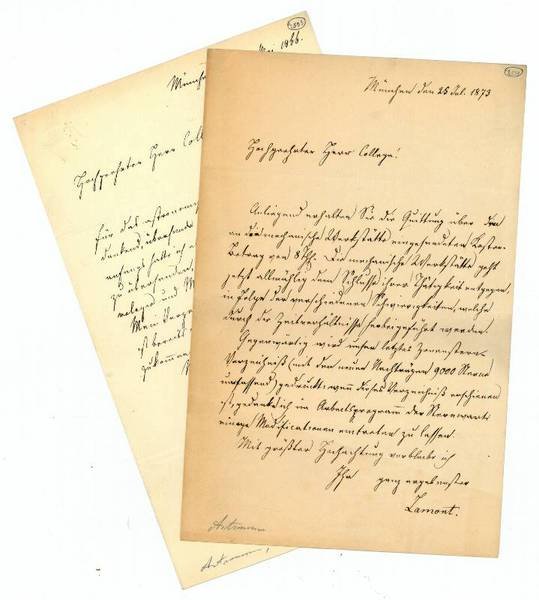 Zusammen (1+1 =) 2 SS. auf Doppelblatt. Gr.-8vo. An einen namentlich nicht genannten Adressaten mit Dank für die Zusendung des "astronomischen Jahrbuchs" (25. V. 1866) und über die "mechanische Werkstätte": "Anliegend erhalten Sie die Quittung über den an die mechanische Werkstätte eingesendeten Kosten-Betrag von 8 Thl. Die mechanische Werkstätte geht jetzt allmählich dem Schlusse ihrer Thätigkeit entgegen, in Folge der verschiedenen Schwierigkeiten, welche durch die Zeitverhältnisse herbeigeführt werden [.]". - Johann von Lamont war nach dem Tod Johann Soldners 1835 Konservator und Direktor der Sternwarte Bogenhausen bei München geworden und verlieb bis zu seinem Lebensende in dieser Stellung. "1852 wurde er Prof. der Astronomie an der Univ. München, der er sein Vermögen vermachte. Lamont erforschte Sternhaufen und Nebelflecke, vermaß die Masse des Uranus neu und verzeichnete Beobachtungen von rund 80000 Sternen, die in den von ihm herausgegebenen 'Observationes astronomicae in specula regia Monachiensi' und 'Annalen der königlichen Sternwarte bei München' veröffentlicht wurden. Durch seine meteorologischen Messungen, Landvermessungen und Arbeiten über den Erdmagnetismus ('Handbuch des Erdmagnetismus', 1849) erwarb sich Lamont auch Verdienste auf den Gebieten der Geophysik und der Geodäsie. 1973 wurde ein Krater auf dem Mars nach Lamont benannt" (DBE).