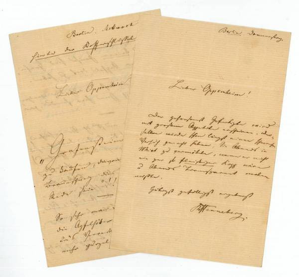 Zusammen 5 SS. 8vo. Beide Briefe an einen Herrn Oppenheim: "'Grafensteiner Äpfel zu kaufen, davon kann in Braunschweig dies Jahr gar keine Rede sein'! So sehr man die Läden und die Apfelhöker schüttelt, es will um's Verrecken kein Grafensteiner mehr purzeln! Zu keinem Preise sind Grafensteiner Aepfel dort zu haben. Darum kosten auch die wenigen, welche ich Ihnen hier sende, gar nichts […]. Eine drückende Bedingung jedoch sehe ich mich gemüßigt, zu stellen, nämlich: 'Daß unser Freund und Ihr Hausknochen Becker die Hälfte davon zu eigner Nutznießung bekommt'. Schlussbemerkung: Eben fällt mir ein, daß auch noch einige Birnen dabei liegen […]" (eh. Brief mit U., 4 SS.). "Der gehorsamst Gefertigte wird mit großem Appetite erscheinen. Derselbe würde schon längst einen schwachen Versuch gemacht haben, Sie Abends in Whist zu vermöbeln, wenn er nicht ein gar so fleißiger Kopf wäre u Abends Transparent malen müsste […]" (eh. Brief mit U., 1 S.). - Henneberg studierte 1845-48 Jura in Göttingen und Heidelberg, war kurzzeitig am Stadtgericht Braunschweig tätig und wandte sich seit 1850 der Malerei zu. Er verbrachte ein Jahr an der Akademie in Antwerpen und war danach bis 1861 in Paris ansässig. Anschließend bereiste er Italien und ließ sich in Rom nieder, bevor er 1863 nach Deutschland zurückkehrte. Zunächst in München wohnhaft, wechselte er 1866 nach Berlin und ging 1873 wieder nach Rom. 1875 kehrte er nach Braunschweig zurück, wo er ein Jahr später starb.