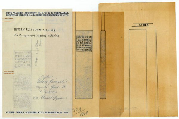 Large 8vo. 3 ff. Pencil and ink on paper. The silver-on-ivory plaque was dedicated by the citizens' association of Vienna's 5th district on the occasion of the 50th birthday of the painter Joseph Sturm. - 1 f. with printed letterhead; the other two on transparent paper. Traces of paperclips; some wrinkling and slight edge defects.