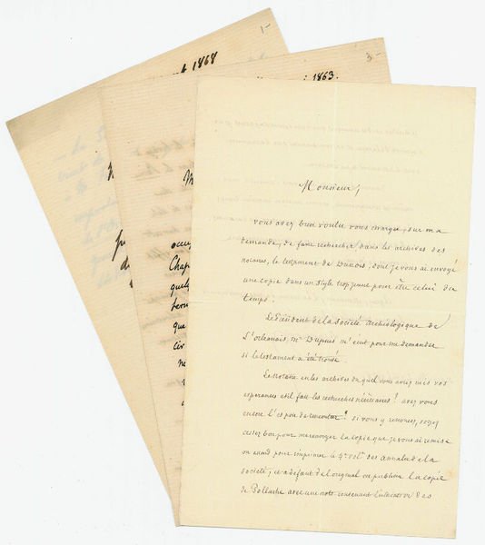 Zusammen (1¾+2¼+1 =) 5 SS. auf 6 (= 3 Doppel)Blatt. Gr.-8vo. Zwei Briefe an einen namentlich nicht genannten Adressaten, ein Brief an einen M. Burby. - François Lenormant, einer der Hauptvertreter der Assyriologie in Frankreich, hatte 1860 den Orient bereist, wo er im Auftrag der Regierung die Ruinen des alten Eleusis untersucht hatte, und wurde nach seiner Rückkehr Unterbibliothekar der Académie des Inscriptions et Belles-Lettres; 1874 wurde er nach dem Tod von Charles Ernest Beulé dessen Nachfolger als Professor der Archäologie an der Nationalbibliothek.