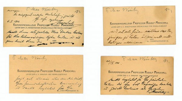 Zusammen 5½ SS. An einen namentlich nicht genannten Adressaten [d. i., wie von fremder Hand mit Bleistift auf der Vorderseite jeder Karte vermerkt, der Journalist und Schriftsteller Max Weinberg, 1856-1929], dem er für kleine Gefälligkeiten dankt und den er herzlich grüßt. - Der in Wien geborene Maler besuchte die Akademie der bildenden Künste, wurde 1903 Kammermedailleur, 1904 Professor der Medailleurkunst an der Akademie und leitete von 1903-38 die Meisterschule für Graveur- und Medailleurkunst. "Marschall schuf rund 1000 Bildnismedaillen, Plaketten und Münzen, u. a. Bildnisse von Kaiser Franz Joseph I. und den Päpsten Leo XIII. und Johannes XXIII. Er gestaltete auch Monumental- und Grabreliefs" (DBE). Vgl. auch Thieme/Becker XXIV, 139; zu Weinberg vgl. DBA II 1379, 85-86.