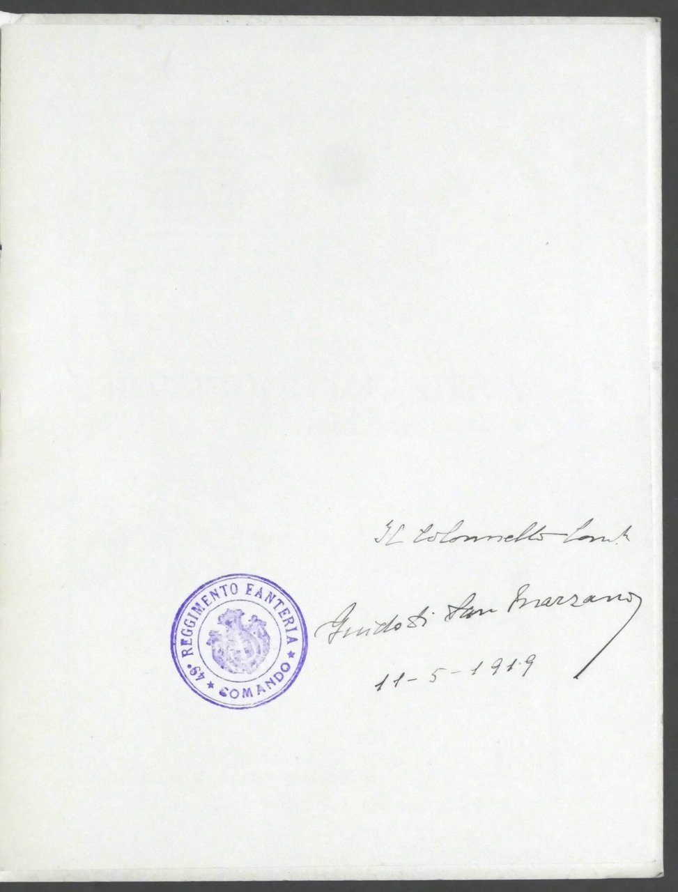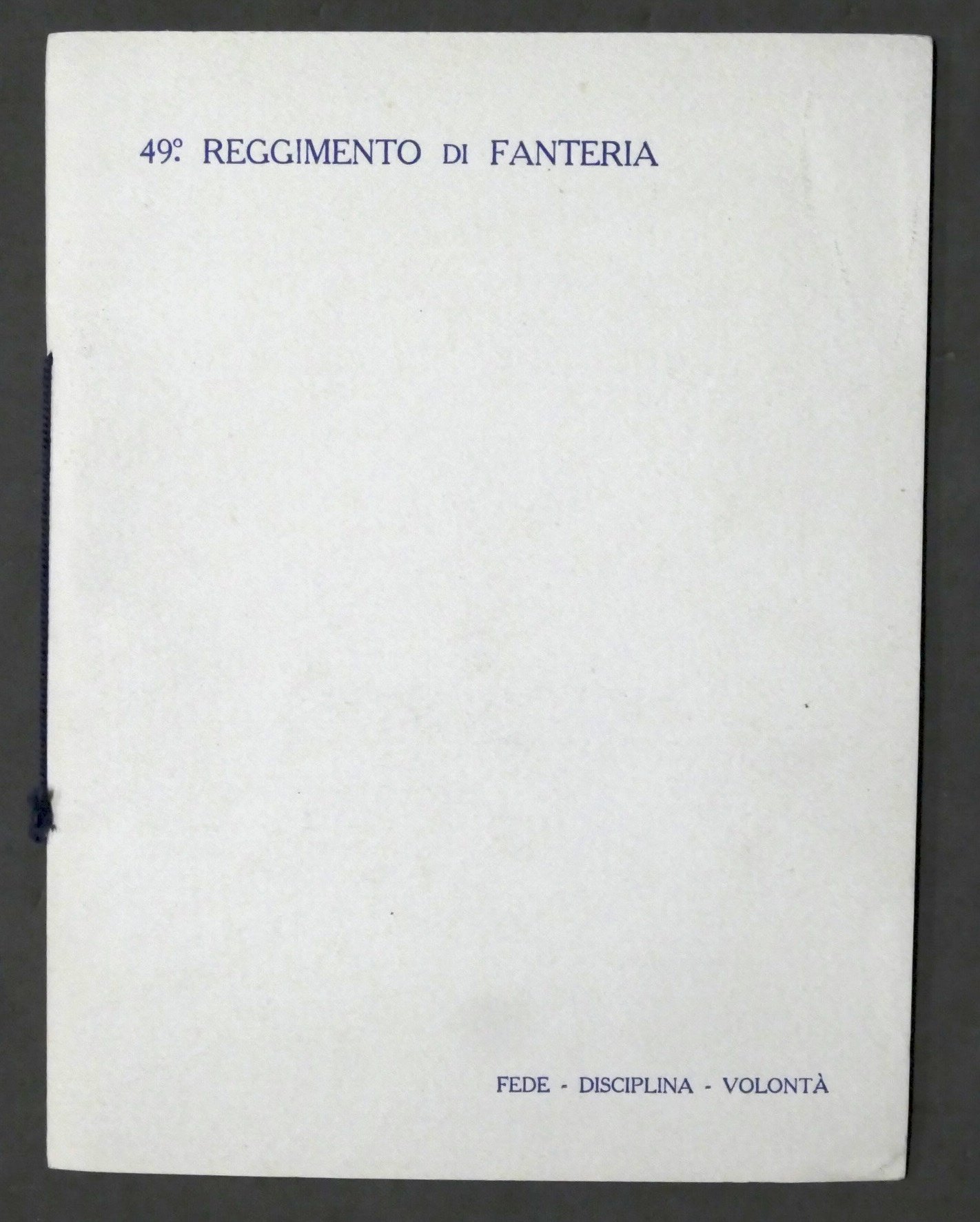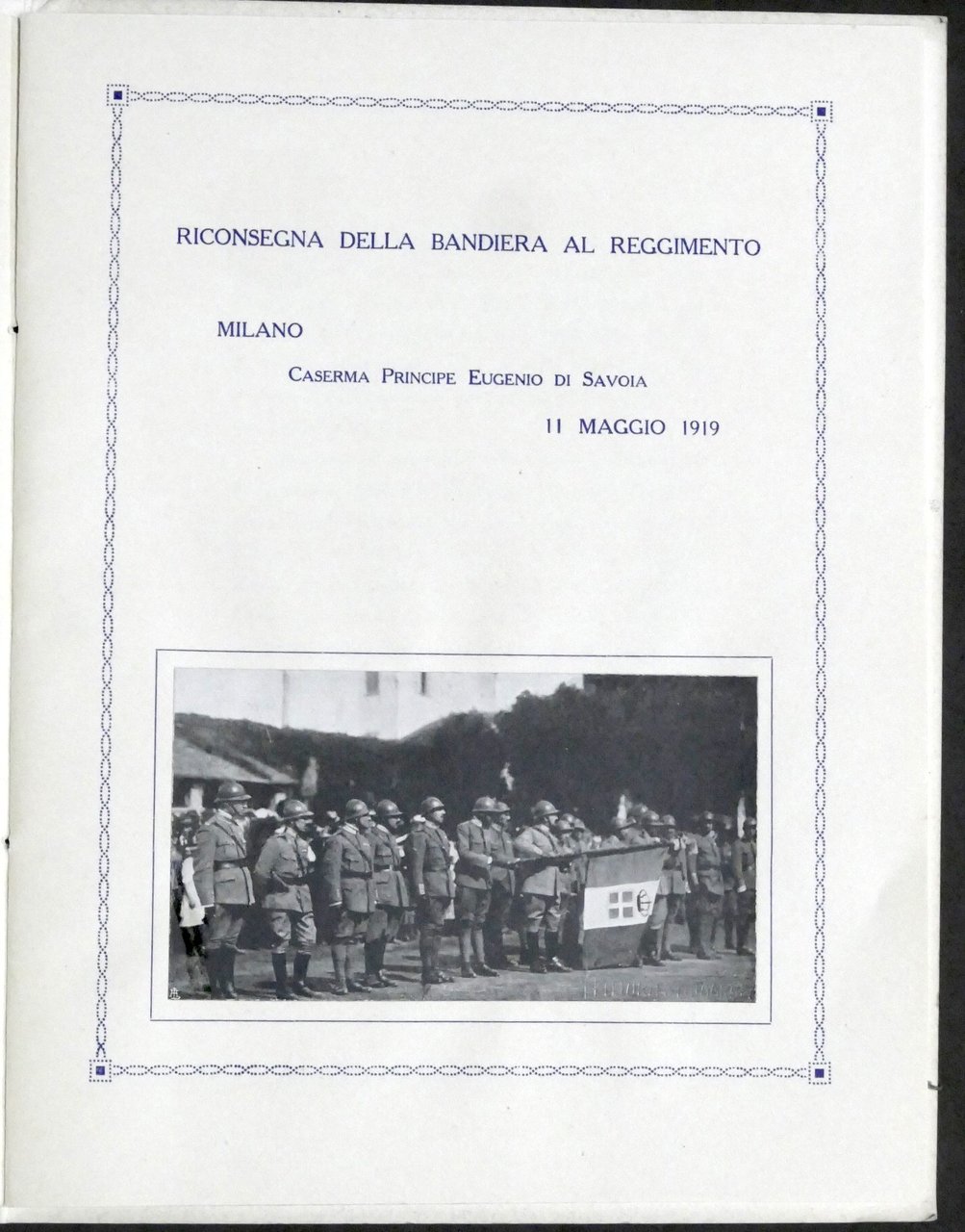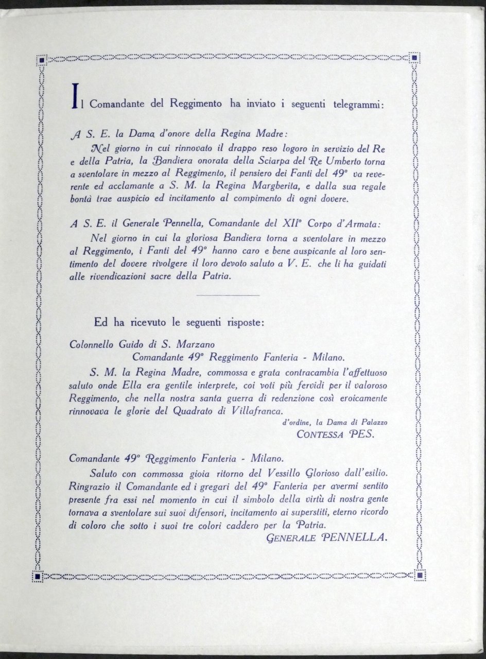 49° Reggimento di Fanteria - Cerimonia di riconsegna della Bandiera al Reggimento - Milano, 11 Maggio 1919 Con autografo del comandante colonnello Guido Asinari di San Marzano Pag. 12 Dimensioni: 18 x 24 cm ca. Copertina morbida - Testo in italiano. Condizioni generali molto buone.
