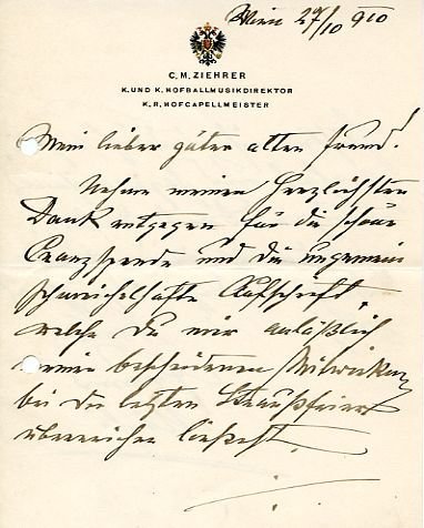 8vo. Altogether 13 pp. Fine letters to an unidentified childhood friend: "Nehme meinen herzlichsten Dank entgegen für die schöne Cranzparade und die ungemein schmeichelhafte Aufschrift welche Du mir anläßlich meiner bescheidenen Mitwirkung bei der letzten Straußparade überreichen ließest [.]" (27 Oct. 1910). - "Du hast keine Ahnung, wie leid es mir thut, daß gerade Du mich nicht zu Hause angetroffen hast, aber mein Zustand forderte Luft - Luft - Luft. Wie würde ich mich gefreut haben, dich meinen liebsten treuen Jugendfreund bei mir begrüssen zu können. Schon der Gedanken, Du warst bei mir, ließ alle meine Jugendjahre die ich mit dir verlebte in meinem Geiste erwachen: Schöne Zeit! goldne Zeit! [.]". - Two letters on stationery with printed letterhead; one letter marked in blue crayon by another hand. Holes punched in left margin (occasionally slightly touching letters).