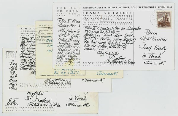 Zusammen 5 SS. Qu.-8vo. Jeweils mit eh. Adresse. Dankt Josef Wesely für ihm übersandte Geburtstagswünsche und “für die schönen guten Äpfel [.] Sie haben Glück mit der Ernte gehabt. Bei meinen Freunden in Vorarlberg war sehr wenig Obst! - Ich esse alle Abende vor dem Einschlafen Apfelmus [.]” (Karte vom 26. I. 1964). - Zu Ambrosi vgl. Vollmer I, 39. - Die Bildseiten der Karten mit Ansichten von Portraitbüsten und sonstiges Plastiken des Bildhauers (Cuno Amiet, Fred Fritsch, Franz Schubert, Burghart Breitner und die ‘Kreuzabnahme’ für das Grabmal von Bürgermeister Elias Wimmer).