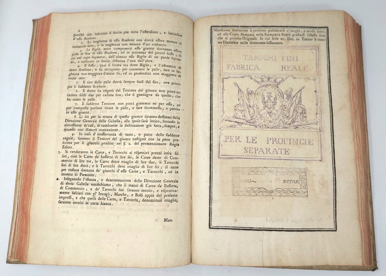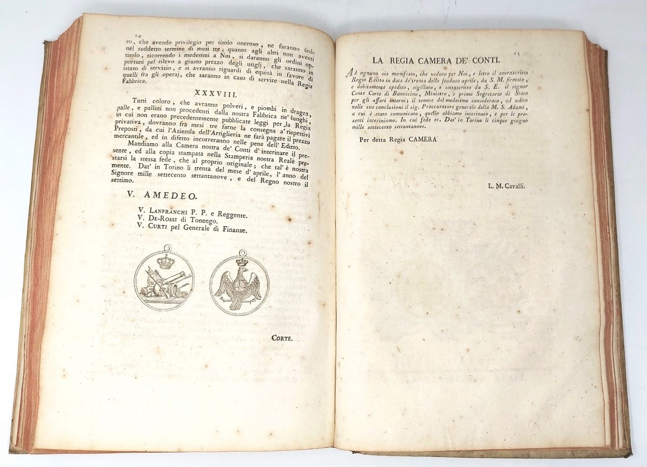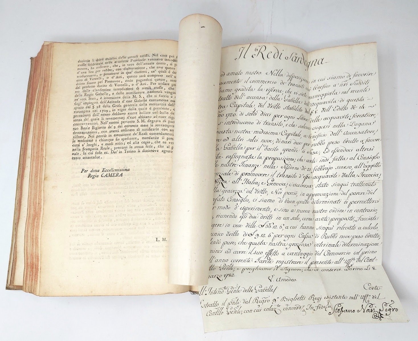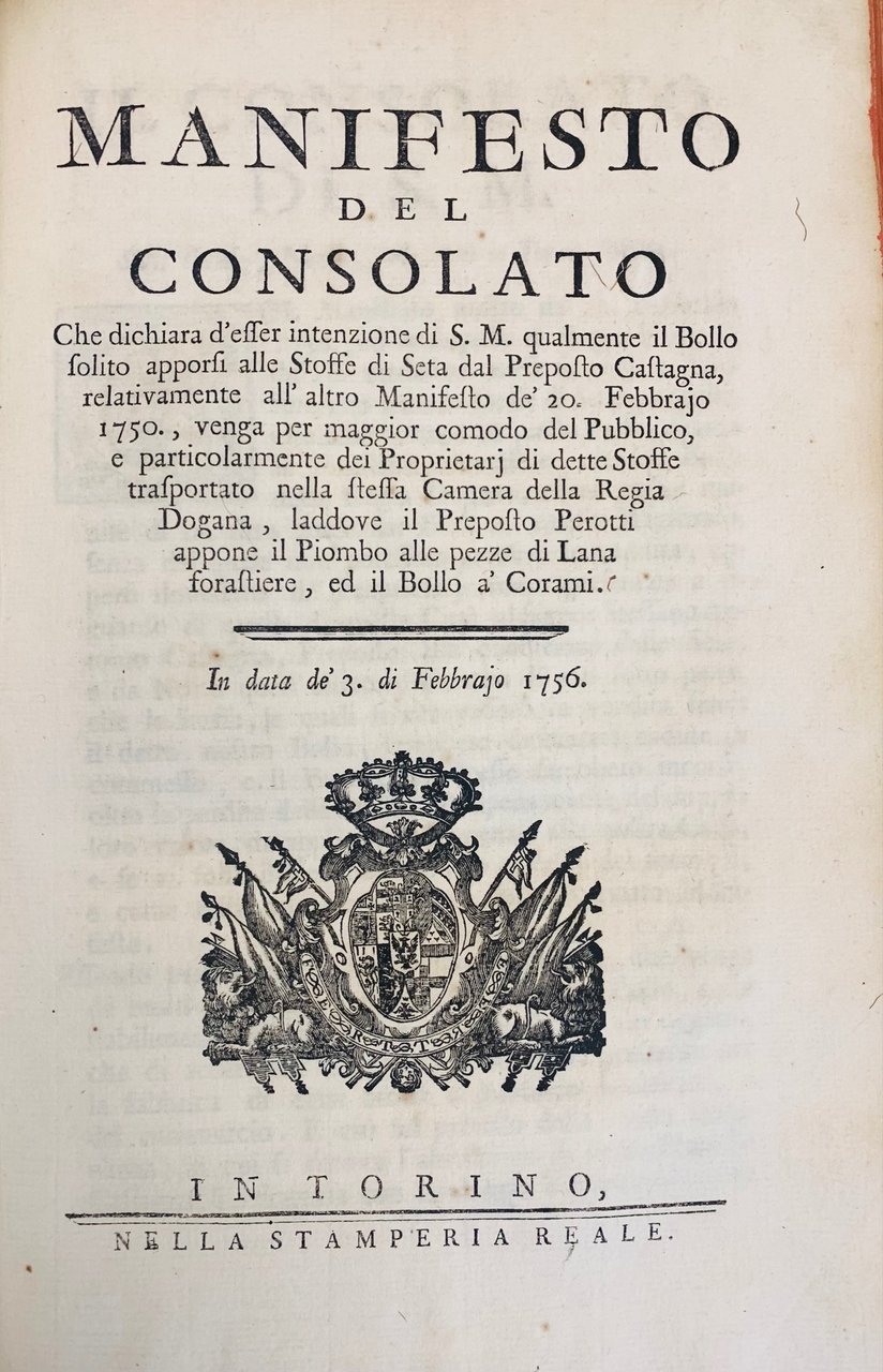 >in-4 (mm 305x200), legatura coeva piena pergamena rigida. Importante e rara raccolta di 78 opuscoli originali di ca. 4-12 pp. l'uno. Tutti con grande stemma sabaudo impresso in silografia al foglio di titolo. Raccolta di 78 manifesti, editti, leggi, disposizioni statali varie, tutti a stampa tranne tre che sono manoscritti. Riguardano la vita economica, il commercio, l'agricoltura, l'artigianato etc. Comprende tra gli altri: Trattato di stabilimento di commercio fra S.M. il re di Sardegna ed il Serenissimo Signor Duca di Modena; Manifesto del Consolato portante alcuni provvedimenti per riparo degli abusi introdottisi nelle Manifatture, ed imbianchimento delle Tele, che si fabbricano in Dronero, nella Valle di magra ed in altri Luoghi; Editto di sua Maestà in dichiarazione delli rispettivi generi di Droghe, e Robe vive, sia riserbati alli Fondachieri, e venditori di esse; Manifesto camerale con cui si rinnova la proibizione dell'estrazione dal Piemonte delle pelli verdi degli agnelli, e capretti, e si prescrivono cautele per il trasporto, e cumuli delle medesime etc. Raro assieme di documenti Sabaudi perfettamente conservati.