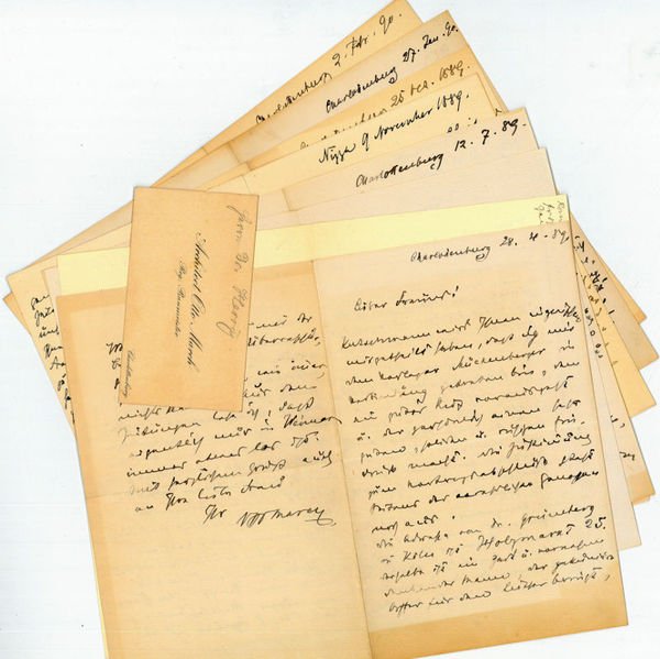9 eigenh. Briefe, 3 eh. Postkarten und 1 eh. Visitenkarte, alle mit U.