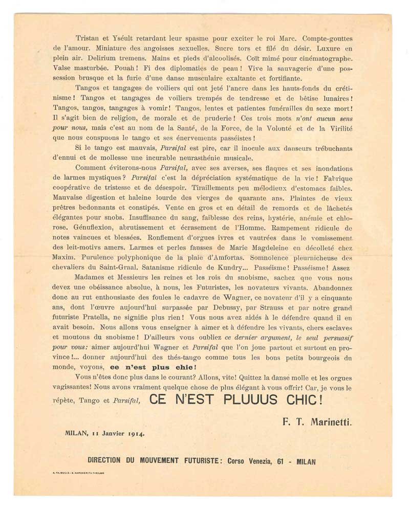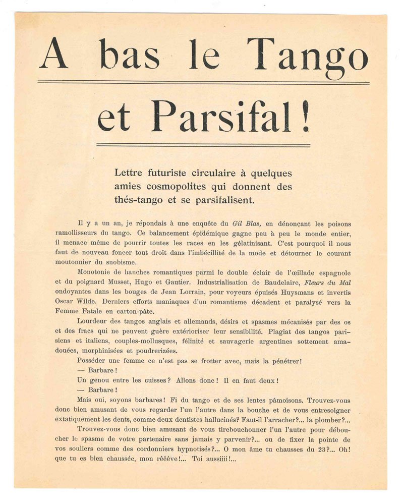A bas le Tango et Parsifal! Lettre futuriste circulaire à quelques amies cosmopolites qui donnent des thés-tango et se parsifalisent