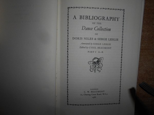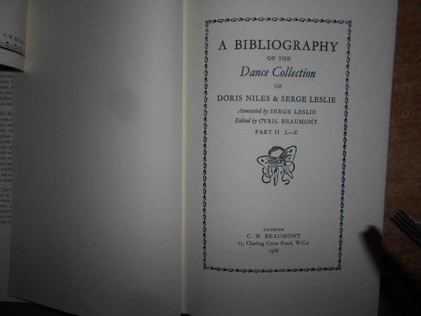DORIS NILES & SERGE LESLIE. London, C.W. Beaumont, 1966/1968. A BIBLIOGRAPHY of the DANCE COLLECTION. 2 volumi in-8° piccolo, tela bleu con titoli in oro ai dorsi, sovracopertine. Part I. Part II. A-K. L-Z. per complessive vii, 594, (2) pp. Ottimo esemplare. Uff. E - V - 3