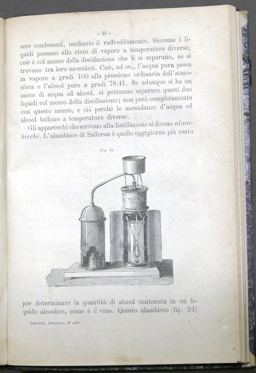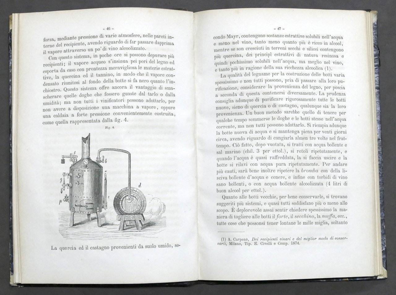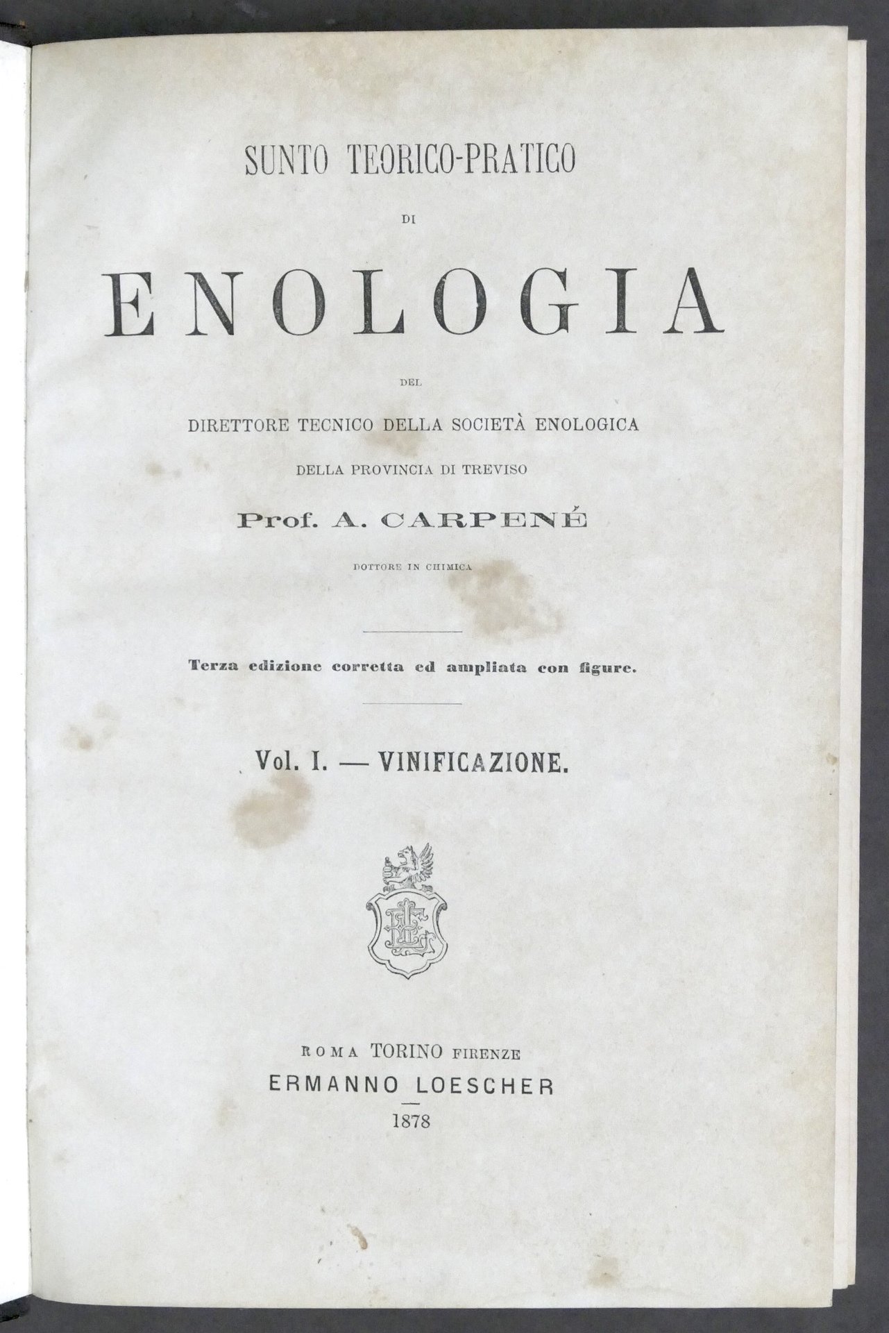 A. Carpenè - Sunto teorico pratico di enologia - 2 volumi in un tomo Vol. I - Vinificazione - Terza edizione corretta ed ampliata con figure - pag. IV, 104 - ed. 1878 Vol. II - Analisi enochimica - Seconda edizione corretta ed ampliata con 29 figure ed una tavola litografica - pag. 106 - ed. 1882 Legatura in mezza pelle - Testo in italiano Condizioni molto buone.
