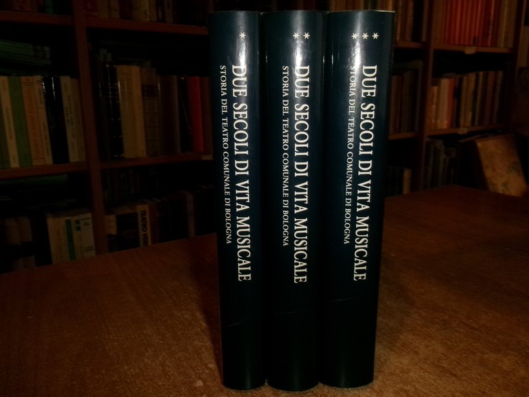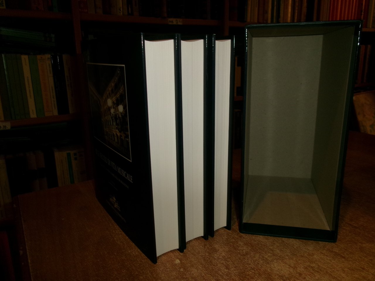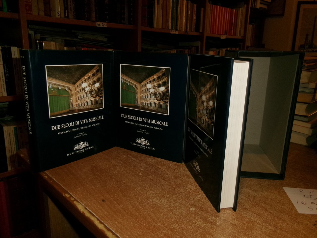 a cura di Lamberto Trezzini. DUE SECOLI DI VITA MUSICALE storia del Teatro Comunale di Bologna. Bologna, Nuova Alfa Editoriale, 1987. 3 volumi con cofanetto in-8°, tela edit. con titoli in oro sui dorsi e sovracopertine ill. a col. xvi, 249 pp. con numerose illustrazioni in nero e in bicromia n.t.; xix, 363 pp.; xiii, 385 pp. Libri come nuovi. Cofanetto con lievi segni del tempo. Neg. in alto sopra 3 in pluriball