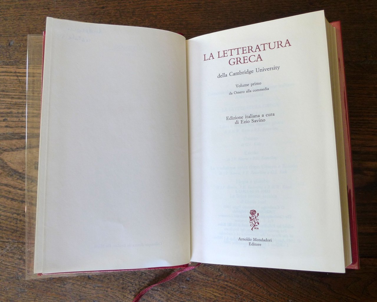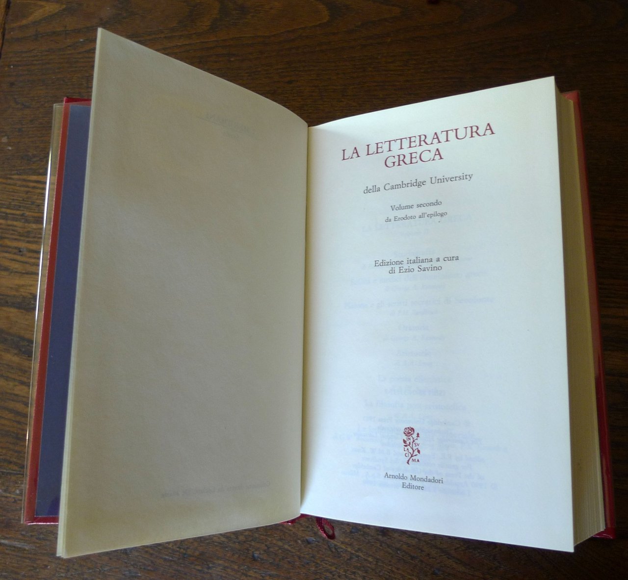 LA LETTERATURA GRECAdella Cambridge University.Edizione italiana a cura di Ezio Savino.VOLUME PRIMO: DA OMERO ALLA COMMEDIAVOLUME SECONDO: DA ERODOTO ALL'EPILOGO.Arnoldo Mondadori Editore, Milano 1989-1990,I edizione I MERIDIANI: novembre 1989 (Vol.I);I edizione I MERIDIANI: ottobre 1990 (Vol.II),copertina rigida, rilegatura in similpelle,sovraccoperta in acetato, custodia in cartoncino,17,5x11 cm., pp.XVII-947; XIV-754,I MERIDIANI / Storiacollezione diretta da Luciano De Maria,ISBN: 88-04-32442-2 (Vol.I),88-04-33917-9 (vol.II),peso: kg.1,1cod.10165CONDIZIONI DEI LIBRI: ottime,firma di appartenenza all'occhiello del Vol.I
