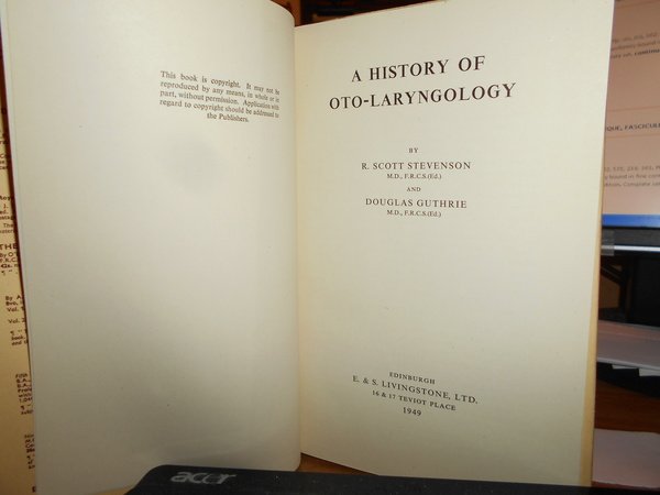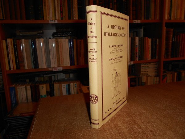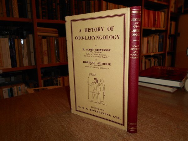 by Scott Stevenson and Douglas Guthrie. Edinburg, E. & S. Livingstone, 1949. A History of Oto-Laryngology. In-8° piccolo, tela rossa edit. con titolo in oro al dorso e sovracopertina. vii, 155 pp. con alcune illustrazioninel testo e 52 figure in tavole fuori testo. Ottimo esemplare in prima edizione. Uff. C - IV - 4 - 2