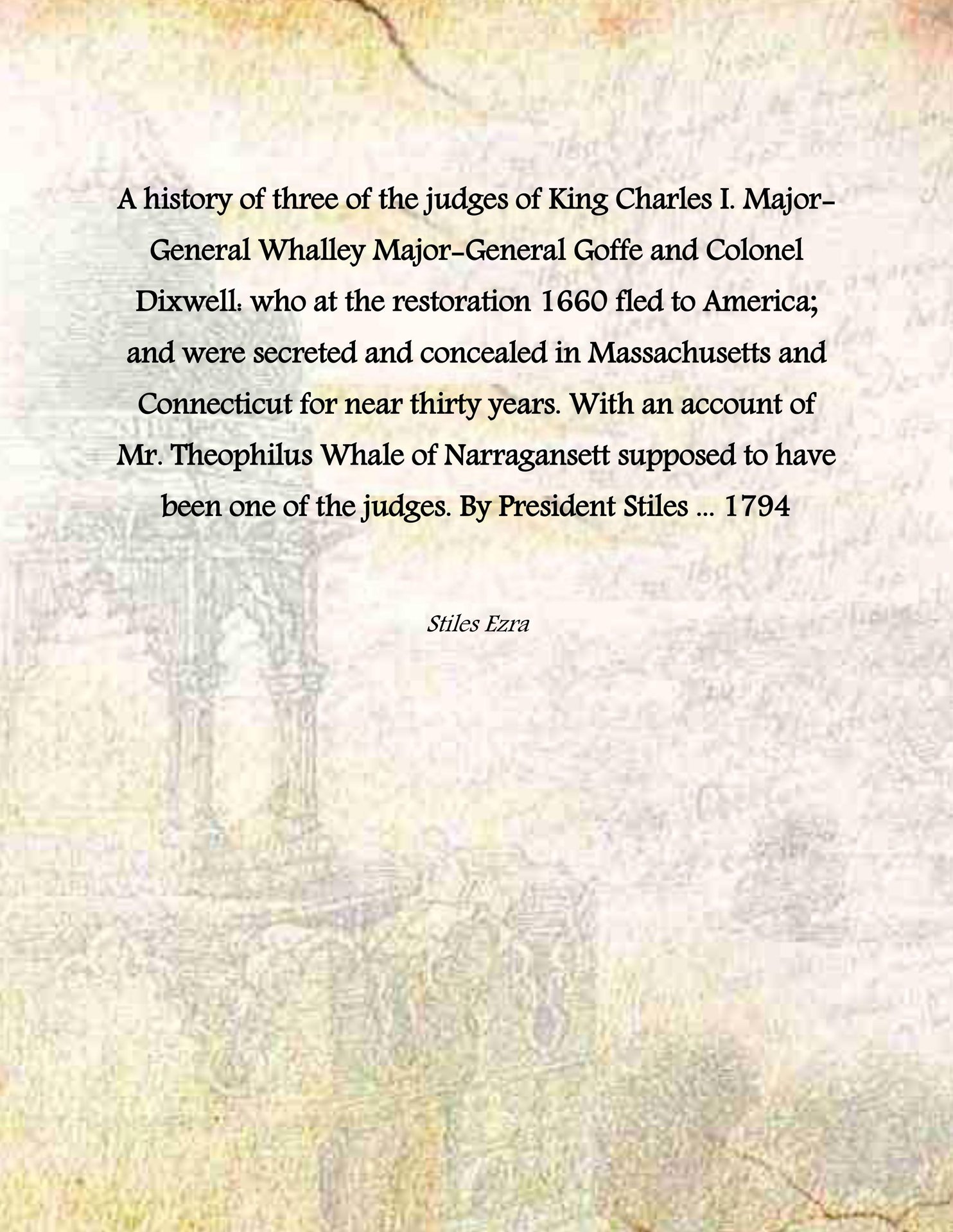 A history of three of the judges of King Charles I. Major-General Whalley Major-General Goffe and Colonel Dixwell: who at the restoration 1660 fled to America; and were secreted and concealed in Massachusetts and Connecticut for near thirty years. With an account of Mr. Theophilus Whale of Narragansett supposed to have been one of the judges. By President Stiles . 1794
